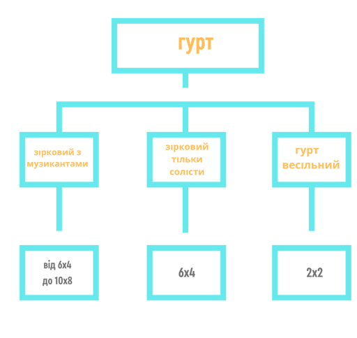- Розмір сцени або подіуму. Прорахуйте розмір в залежності від обраного гурту, кількості людей на сцені та запланованого наповнення. Це важливо для забезпечення комфортної роботи музикантів та хореографів та виконання технічних райдерів зіркових артистів.